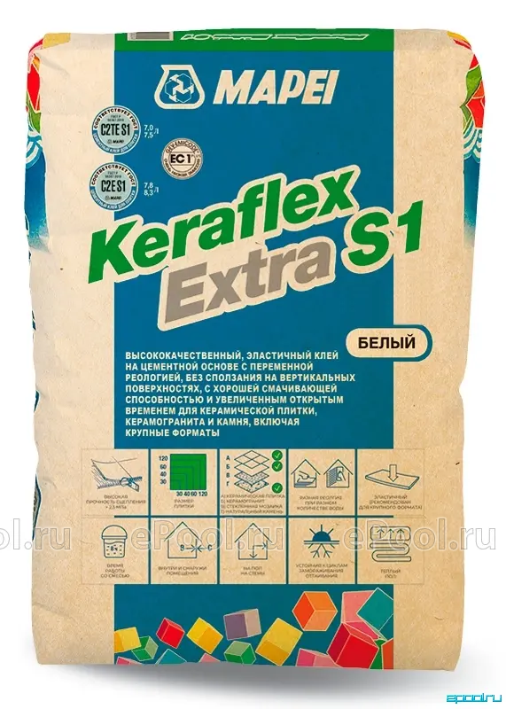 Вес: 25КГ Время корректировки плитки: 45 минут Легкие пешие нагрузки: через 24 часа Открытое время: > 30 минут Предназначен для укладки керамической плитки, тяжёлых и крупноформатных плит, керамогранита и натурального камня.
