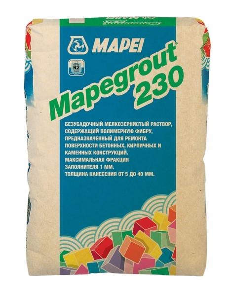 Вес: 25 КГ Прочности на сжатие: ≥ 20 МПа Кол-во воды: 4,4–4,6 л воды на 25 КГ MAPEGROUT 230 Предназначена для восстановления геометрических параметров ограждающих конструкций и неконструкционного ремонта бетонных и железобетонных конструкций класса до В20.